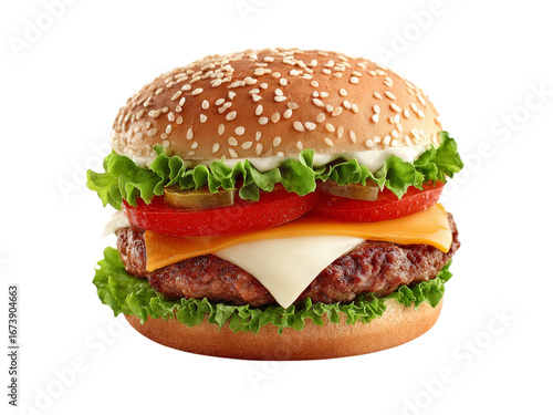 Juicy cheeseburger with sesame seed bun lettuce tomato, Isolated On White Background, Png Transparent