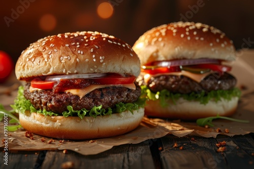 Juicy Cheeseburgers with Fresh Toppings on Wooden Table