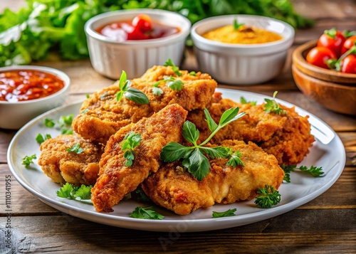 Juicy Delicious Fried Chicken Fillet Steaks on a White Plate Served with Fresh Herbs and a Side of Dipping Sauce, Perfectly Cooked for a Mouthwatering Culinary Experience