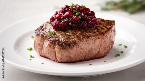 Juicy Filet Mignon with Cranberry Sauce and Chives on White Plate: Exquisite Gourmet Meal, Fine Dining Experience, Restaurant Quality, Close-Up
