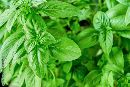 Juicy green basil growing in a pot, large green basil leaves can be used as a background for a culinary theme