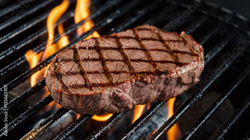 Juicy grilled beef steak with perfect sear marks on a flaming hot grill. High-quality close-up food photography with a dark background.