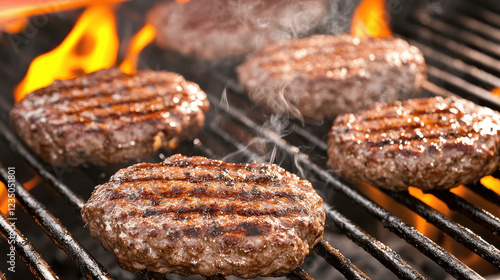Juicy grilled burgers sizzling on an open flame at a summer barbecue gathering with friends