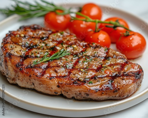 Juicy grilled steak accompanied by vibrant roasted cherry tomatoes and herbs