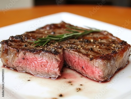 Juicy Grilled Steak Cut on White Plate Close Up Delicious Food Photography Rosemary Garnish Gourmet Meal