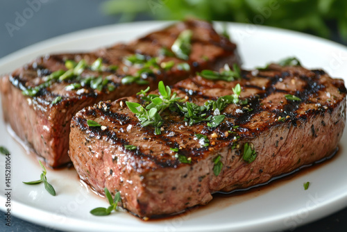 Juicy grilled steak with caramelized edges, served medium rare, garnished with fresh herbs and a side of roasted vegetables on a wooden platter.
