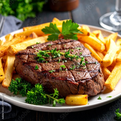Juicy Grilled Steak with Crispy French Fries Delicious Meal.