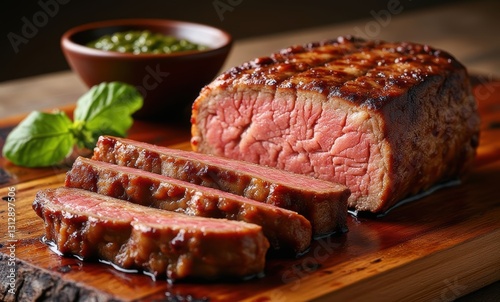 steak, grilled meat, beef, cooking, food photography, garnish, wooden board, delicious, culinary, dinner, meal, sliced, sauce, eatery, appetising, succulent, bar-b-q, herb, organic, flavorful, dining, picnic, tasty, kitchen, epicure, grilling, presentation, fancy, home cooking, garnished, rare, savoury, plate, butcher, cookery, seasoning, dish, steakhouse, charred