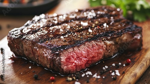 Juicy Grilled Steak with Seasoning on Wooden Board