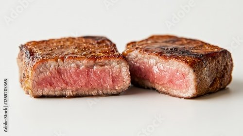 Juicy, perfectly cooked steak cut in half, showcasing a tender, pink interior.