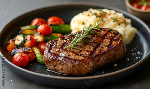 Juicy, perfectly grilled steak garnished with rosemary, served with roasted vegetables and mashed potatoes, served on a dark wooden table in fine dining style