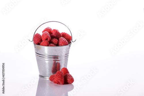 Juicy red fresh raspberries in a bucket isolated on white background. Full depth of field.