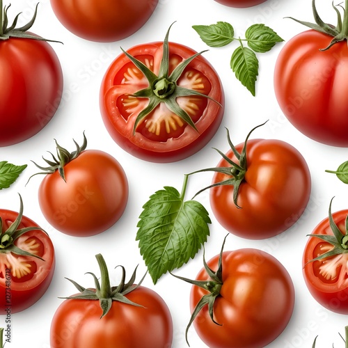 tomatoes, tomatoes, red tomato, red tomato, ripe tomatoes, basil, herb, herb, vegetable, vegetable, food, ingredient, ingredient, health food, healthy eating, seamless pattern, white background, topview, closeup, healthy, fresh, vibrant