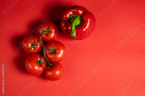 Juicy red vegetables tomatoes and bell peppers on a bright red background. Kitchen. background for restaurant. tomato sprig.