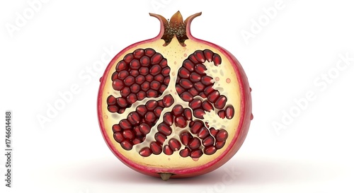 pomegranate, fruit, half, cut, ripe, juicy, red, seed, fresh, healthy, food, nourishment, organic, natural, whole, studio, isolated, white background, closeup, macro, detail, texture, vibrant, colours, sweet, tart, exotic, antioxidant, vitamin, diet, refreshing, snack, ingredient, culinary, raw, botanical, plant, produce, edible, garnish, dessert, juice, beverage