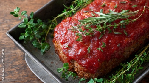 Juicy rosemary-topped meatloaf, adorned with tangy tomato glaze, a savory centerpiece for Midsummer feast or Hygge-inspired gatherings