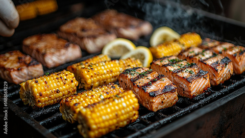 salmon, fish, grill, corn, lemon, grilled, food, bar-b-q, cooking, meal, dinner, healthy, cookery, eat, vegetable, nourishment, diet, fillet, lunch, roasted, epicure, cookout, summer, garden, backyard, party, juicy, ready to eat, bar-b-q, scorching, charred, seasoned, fire, slice, cob, bar-b-q