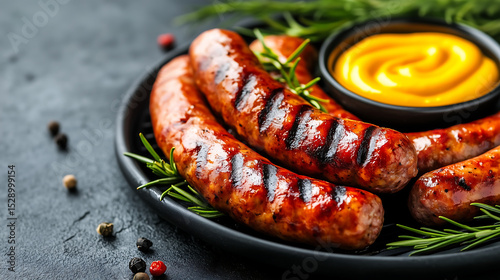 Juicy sausage links sizzling on the grill, charred and smoky, served with mustard for a rustic and hearty meal full of bold, savory flavor