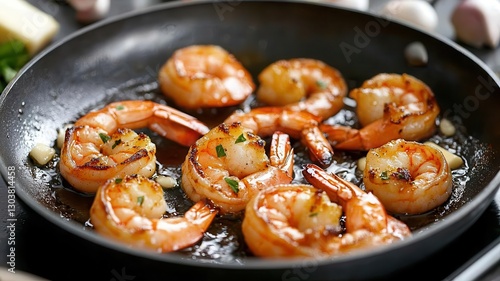 Juicy shrimp sauteed in a pan, garnished with herbs, showcasing a delicious seafood dish that's perfect for any meal.