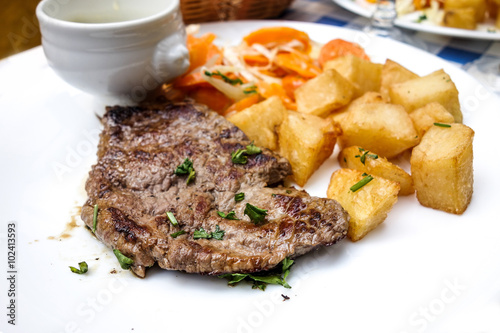 juicy steak beef meat with tomato and french fries