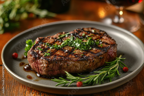 Juicy steak sizzling on a hot grill, emitting mouthwatering aroma, seared to perfection with grill marks, garnished with fresh herbs.