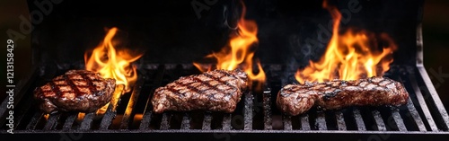 Juicy steaks sizzle on a hot barbecue grill as flames dance around them. The delicious aroma fills the air, creating a perfect summer gathering atmosphere