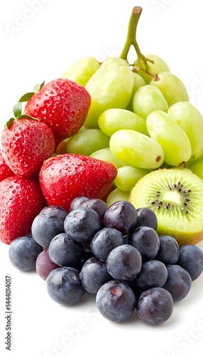 Juicy strawberries, green and black grapes, and a kiwi slice arranged together on a white background