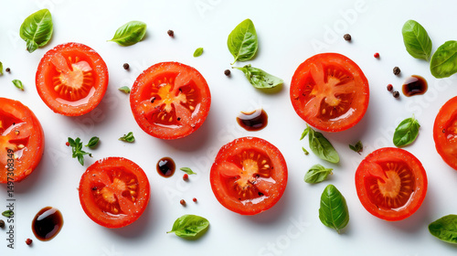Juicy tomato slices arranged with fresh basil leaves and spices create vibrant and appetizing display