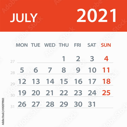 july, 2021, 7, calendar, year, today, page, isolated, day, paper, leaf, flat, modern, colours, red, grey, white, time, planning, vector, reminder, blank, number, organisation, deadline, background, diary, tuesday, sunday, friday, th, wednesday, monday, holiday, week, month, chronological, monthly