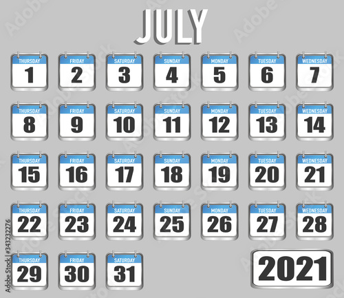 July of 2021 year. Month, day, week. Simply trendy design. Vector illustration background for web, business, reminder, planner, organiser