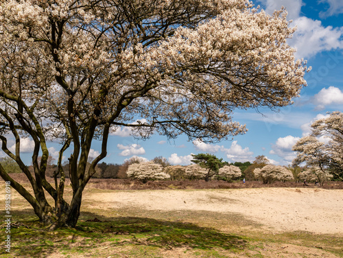 Juneberry trees, Amelanchier lamarkii, blooming in Zuiderheide nature reserve in Het Gooi, North Holland, Netherlands