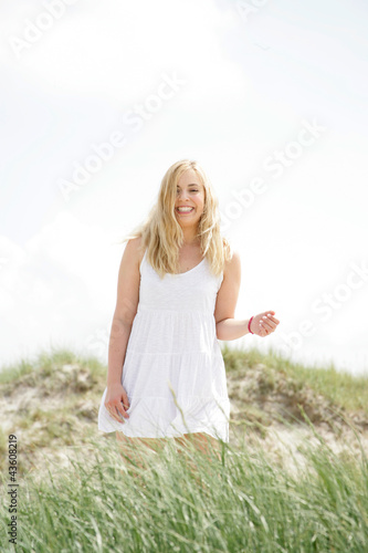 girl, woman, blond, young, summer, sun, recreation, heaven, dress, sundress, beach, sand, north sea, baltic sea, dune, dune, grass, sea, vacation, fun, move, fun, relaxation, recreation, run, jump