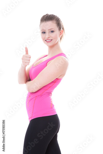 woman, isolated, young, happy, white, portrait, beauty, fitness, person, thumb up, signs, smile, teenage, pretty, hand, exercise, merry, sport, casual, body, healthy, face, girl, young, gesture, symbol