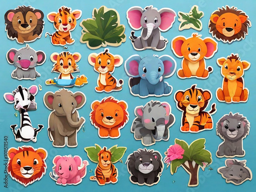 animal, cartoon, set, vector, cat, animal, illustration, bear, pet, baby, lion, cute, zoo, icon, character, collection, elephant, tiger, giraffe, funny, jungle, character, fun, children, sticker, lion, tiger, elephant, giraffe, zebra, monkey, crocodile, parrot, snake, leopard, hippo, generative, ai
