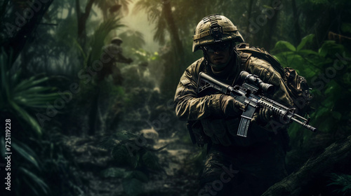Jungle Mission: Soldier Moving to Battle in Jungle