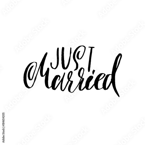 Just married. Dry brush lettering. Hand drawn calligraphy card. Modern typography poster. Vector illustration.