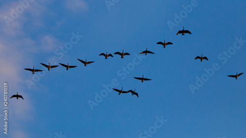 canadian goose, goose, canada, train, migratory bird, water, evening, cloud, heaven, troop, group, flying, fly, formation