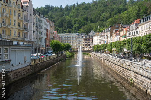 Karlovy Vary, Czech Republic, June 2019 - view of some beautiful houses by the Tepla River