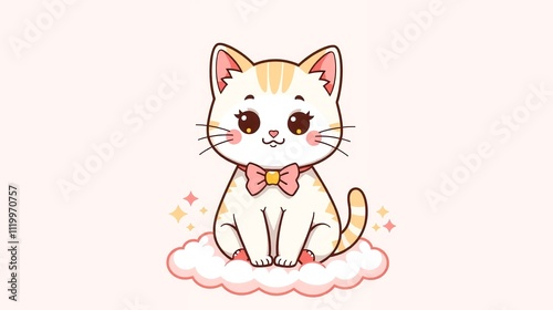 Kawaii style, pastel colors, cartoon cat with a bow tie sitting on a cloud.