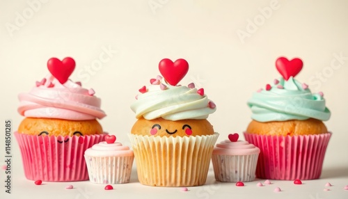 Kawaii-style cupcakes with heart toppings and pastel-colored frosting for Valentine treats.