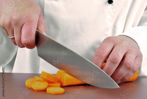 Köchin in einer Kochjacke schneidet mit einem Küchenmesser ein