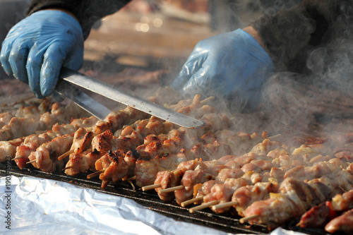 Kebab on wooden skewers on grill. Shashlik or shashlyk – meat skewers on grill outside. Shish kebab on a barbecue. Roast meat on BBQ. Selective focus through smoke.