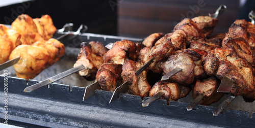 Kebabs on skewers, close-up. Food court at the fair, outdoor cooking. Hot and tasty food. Cooking shish kebab on coals. Grilled kebab cooked on a metal skewer