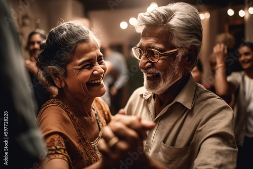 Keep moving. Romantic senior family couple wife and husband dancing to music together in living room. Happy life moments. Generative Ai.