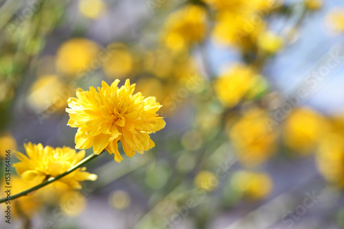 Kerria japonica. Yellow flowers Japanese kerria, vivid bush flowering in spring. Yellow flowers represent nature beauty, floral energy, seasonal inspiration. Natural decoration of city, flower bed