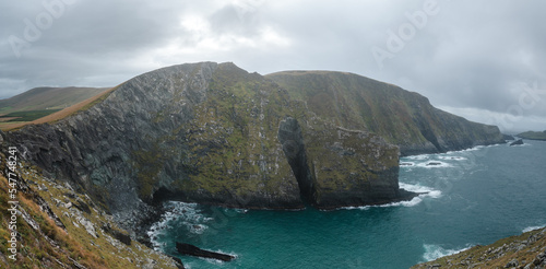 Kerry cliffs with green grass and dramatic clouds in cloudy autumn day, Kerry, Ireland.