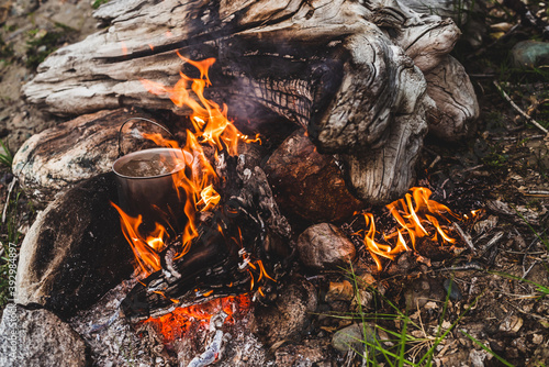 Kettle stands on fire. Cooking food at fire in wild. Beautiful big log burns in bonfire close-up. Survival in wild nature. Wonderful flame with caldron. Pot is on flames. Campfire background.