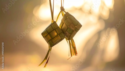Ketupat hanging with blurred silhouette shadow against warm sunrise background with shallow depth illusion