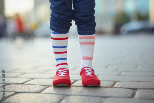 Kid legs with different pair of socks and red sneakers standing in the street outdoors. Child foots in mismatched socks. Odd Socks day, Anti-Bullying Week, Down syndrome awareness concept