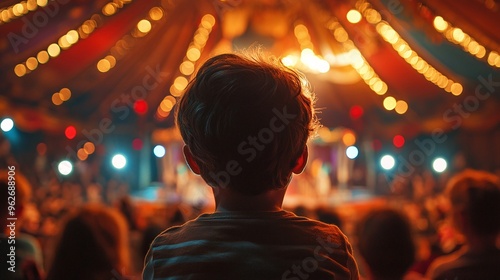 kids and children watching an exciting circus show on stage inside a carnival celebration with crowd people in a dome tent, capturing the joyful atmosphere and fun lifestyle